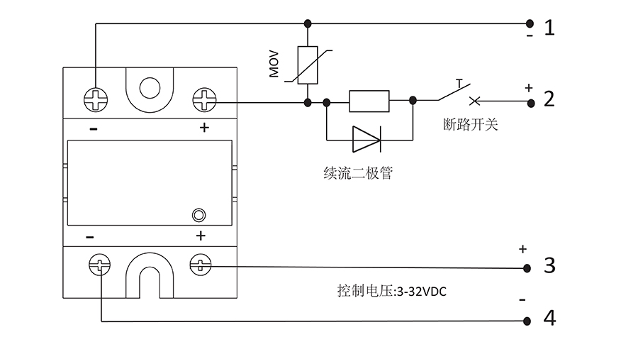 3、感性負載時必須在負載兩端并接一個續(xù)流二極管,并在輸出端并接壓敏電阻(壓敏電阻(MOV)按電源電壓的1~1.5倍選?。?,以防過壓時損壞輸出管。